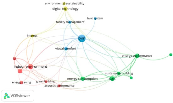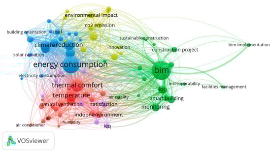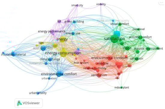 Cluster map generated by research results of the terms “environmental comfort”, “building” and “sustainability”.