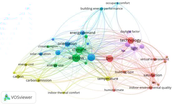 The third map was generated through a search using the terms “visual comfort” and “BIM”, which retrieved 328 documents. The software analysis resulted in 8467 keywords identified in the “title” and “abstract” fields. The minimum number of occurrences was limited to 10, reducing it to 242 keywords. The software’s relevance calculation considered 145 relevant words out of the 242 limited keywords. After analyzing the results obtained by the software and removing the words that were not part of the topic, the second cluster map was generated, shown in Figure 8. This map generated six clusters. The first cluster, in red, shows the importance of using technology to develop visual comfort. Technology in this area helps to implement innovative strategies and study the best parameters for the environment. This can be seen in words such as “technology”, “BIM”, and “virtual reality”. The second and third clusters, in green and blue, respectively, contain terms such as “climate”, “window”, “energy use”, “orientation” and “solar radiation”. These clusters deal with some variables that can influence visual comfort in environments. The fourth cluster, in yellow, shows the impacts generated during and after construction. This cluster shows the importance of studies aimed at mitigating these impacts, always seeking to maintain quality and comfort for the user. This can be seen in words such as “carbon emission”, “temperature” and “energy cost”. The fifth cluster, in lilac, contains terms such as “daylight factor”, “lux” and “light”. These words show the importance of studying lighting in terms of visual comfort, which can directly affect the user’s well-being and productivity. The sixth cluster, in light blue, has two words: “occupant comfort” and “building energy performance”. This cluster shows a concern with user sensations and the results that the building will generate through the application of the new technologies, materials and tools studied.