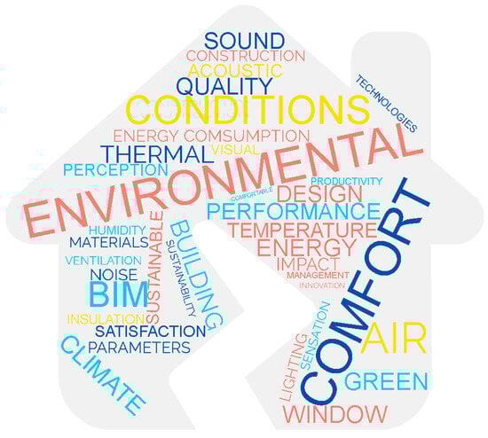 The analysis carried out in VOSviewer based on the analysis of the cluster maps led to the most relevant words on the topic covered in this article, shown in Figure 10, which are environmental, comfort, BIM, window, climate, thermal, sound, lighting, satisfaction, and conditions. The three dimensions also appear as the most relevant themes: thermal, acoustic, and visual comfort.