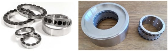 PCD bearings are specifically designed to sustain thrust loads, radial loads or a combination of them. Figure 2 illustrates some kinds of PCD bearings. Drilling tool bearing applications include thrust bearing in turbo-drills and thrust or radial bearing in drilling motors, coring tools and power generation turbines. The keys element for a PCD bearing are extreme hardness and high thermal conductivity, which lead to wear resistance and heat removal. In addition, high strength and toughness and low friction make this material very interesting for application on bearings. They simplify equipment and assemblies by eliminating the need for seals and auxiliary lubrication systems. Research on this type of material and its application is focused on wear and abrasion behavior [5,6,7,8]. In [9], an important study about life behavior and a lubrication regime is reported. Studies on friction, constant load life and loading capacity are shown for various types of thrust bearings. In [10], a methodology for the designing and building of simple foil thrust bearings intended for parametric performance testing and low marginal costs is described. A test rig for the measurement of the load performance of water-lubricated hydrostatic/hydrodynamic thrust bearings operating under conditions typical of cryogenic turbo pumps (TPs) is reported in [11]. Studies have been carried out mainly on the wear and the life limit of these bearings, without focusing too much on the rotor dynamics aspects, due also to the low speeds in their usual application. One of the characteristic and fundamental aspects of this type of bearing concerns the low dry friction coefficient, which allows it to be used without the aid of synthetic lubricants such as grease and oil. It also has a very high resistance to chemical agents and corrosive environments and can withstand very high loads. The strategic importance that these bearings could have in turbomachinery applications (especially for subsea and remote location oil and gas extraction) becomes immediately evident for various reasons. Some studies about subsea electric pumps are reported in [12,13]. Currently, the most important concerns in subsea applications are represented by higher costs than surface applications with the same system components, both in terms of initial costs and maintenance. For this reason, the possibility of completely removing the auxiliary systems for oil circulation, often very unreliable systems that lead to the interruption of the correct functioning of the machine, is a significant strategic advantage. Furthermore, the use of PCD bearings allows the complete removal of the seals necessary to separate the process fluids from the auxiliary ones; therefore, the use of multiphase machines leads to an increase in the quantity of fluid processed. These machines have very high rotational speeds for the typical applications of these bearings. It is necessary, then, to carry out research aimed at understanding the physical phenomena concerning their behavior and develop a mathematical model that predicts their behavior. With the aim of testing different classes of radial PCD bearings, an innovative test rig was designed. Thanks to its high modularity, three different kinds of radial PCD bearings can be tested. In addition, the test rig has a tilting frame which allows it to reach speeds up to 6000 rpm in both vertical and horizontal configurations.