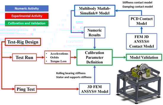 The present activity can be divided into two fundamental parts, one experimental and one numerical, followed by the validation of the numerical model with the experimental data, as briefly summarized in Figure 3. Contact models represent a fundamental aspect of the numerical approach of the project. The selection of an appropriate model for a given contact problem is still an important and challenging issue to be addressed. Some really good reviews of contact force models that are used in the dynamical analysis of multibody systems can be found in [14,15,16]. The present paper is focused only on the experimental part of the work, with the objective to describe the innovative test rig in detail and present the main results obtained from the experimental test campaign that was carried out.