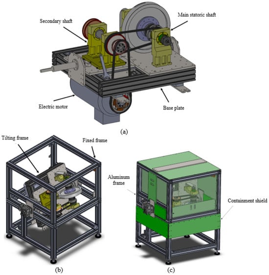 Test rig CAD model overview: (a) tilting base with motor, secondary shaft and main axis; (b) frame definition; and (c) aluminum frame with steel armor.