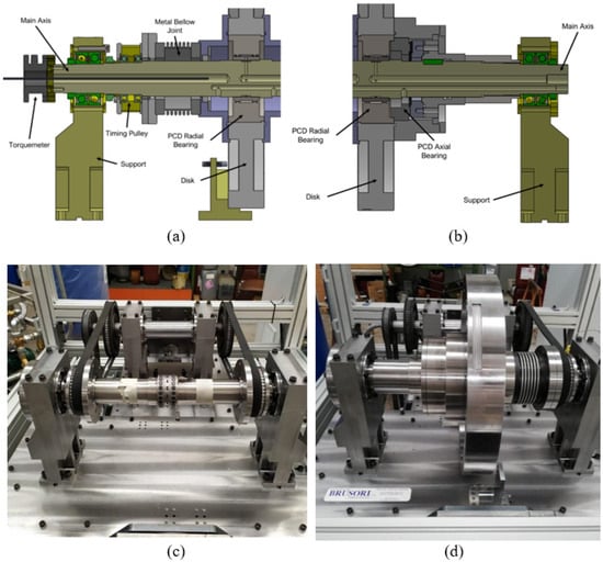 The two solutions were almost equivalent in their ability to effectively represent the behavior of the real turbomachine. Furthermore, the magnetic coupling had some advantages in terms of simplicity of configuration. However, the TRL and the time and costs associated with procurement oriented the choice to the advantage of the more conventional flexible coupling. Torque transmission is accomplished by a timing pulley–belt system. The number of belts from the secondary shaft to the rotor system depends on the configuration. The horizontal configuration (Figure 5a,c) includes two belts and a symmetric transmission system. Instead, in the vertical configuration (Figure 5b,d), the left belt and pulley system is substituted by an axial PCD bearing to react to the gravitational force, so the torque transmission is provided by a single belt. On the main stationary shaft, the timing pulley is supported on roller bearings, and the torque is transmitted to the rotor by 2 (or 1 in the vertical configuration) high-precision and torsional stiff metal bellow couplings. The main purpose of the metal bellow is to decouple the dynamic response of the rotor (and so the PCD) from the rest of the rotational parts of the test rig. Thanks to the high modularity of the design, changing configurations is a simple and fast procedure.