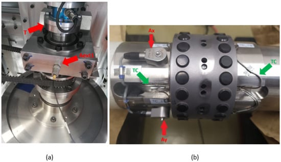 (a) Torquemeter (T) and an external accelerometer (Aext1) and (b) internal accelerometers (Ax and Ay) and internal thermocouples (TCs).