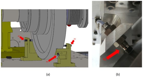 The probes are positioned by two brackets (Figure 10a) bolted to the base plate. Both radial and axial probes have an angular relative position of 90°. The axial probes face opposite sides of the rotor, so it was possible to characterize the displacement of the rotor. Figure 10b shows a close-up view of one of the proximity probes.