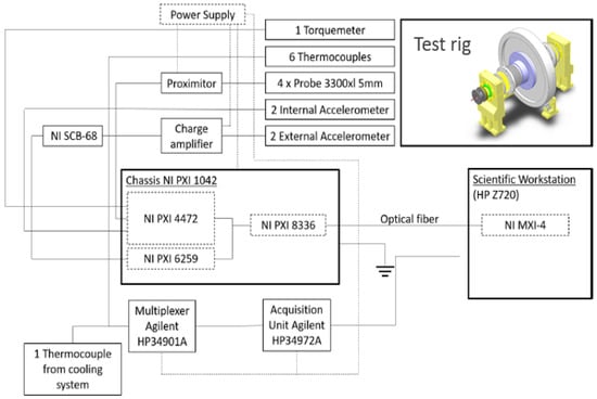 The dynamic acquisition system (shown in Figure 11) consists of the following: a proximitor for each eddy current probe, a charge amplifier for the external accelerometer and a specific board (NISCB-68) to read signals with the chassis, a chassis (NI PXI 1042) with 2 boards to acquire dynamic signals (NI PXI 4472 and NI PXI 6259 respectively) and 1 board (NI PXI 8336) to communicate with the scientific workstation and a scientific workstation (HP Z720) with a specific board (NI MXI-4) to communicate with the acquiring chassis using an optical fiber.