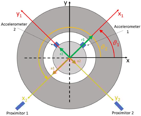 This transformation was necessary considering that the experimental and numerical results had different reference systems. To be more easily compared, it was necessary to make a rigid rotation of the reference systems and, consequently, of the time series. A scheme representing the cross-section of the center of the test rig is shown in Figure 12. The proximity probes and the accelerometers are represented in blue, with their reference system in red (Ox1y1) and yellow (Ox2y2), respectively, while the numeric reference is in black (Oxy). Note that the sensor reference systems were rotated by 180°. In green are reported two example signals for displacements (r1 and r2) and in orange are reported accelerations (a1 and a2).