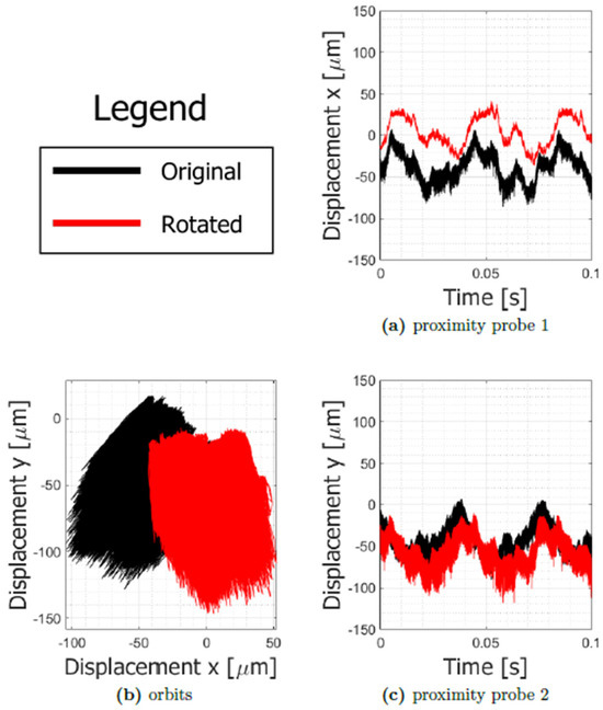 Considering the scheme described in Figure 12, with the angle θ1 between the proximitor reference system and the numeric reference system of 45°, with the Equation (1) it was possible to rotate the time series of the rotor displacements: