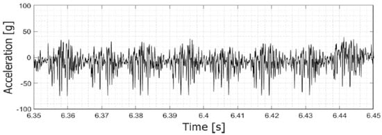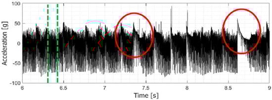 This type of post process was applied to all accelerometer signals because the acceleration values developed on the stator axis exceeded those that had been predicted. Consequently, the accelerometers often went into saturation, with a behavior similar to that reported in Figure 14, highlighted with red ellipses.