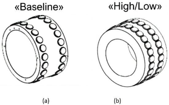 The tested configurations of the test rig were Horizontal “Baseline” (HB), Vertical “Baseline” (VB), Vertical “Low Clearance” (VL) and Vertical “High Clearance” (VH). Geometrical and inertial properties of the tested configurations are reported within Table 3 while Figure 16 illustrates the drawings of the radial PCD inner ring for baseline and low/high clearance configurations.