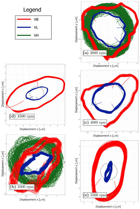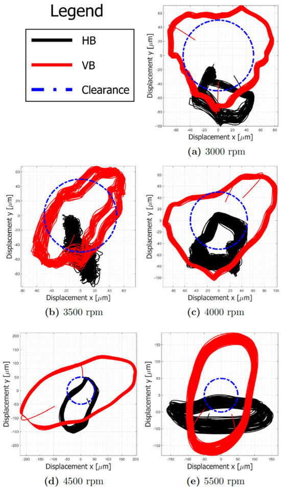 A comparison between the orbits for the tested configuration is reported in Figure 17. The dashed blue line, representing the clearance circle, is centered in the nominal axis of the stator. This circle is just a representation; the real center depends on the stator deformation. In black are shown the results for the Horizontal “Baseline” case, while in red are those for the Vertical “Baseline”. The effect of gravity is evident at all revolution speeds. Furthermore, the shape of the orbits is different; in particular, the horizontal configuration has a preferential area of rubbing due to gravity which, at lower rotation speeds, pulls the rotor downwards. Beyond a certain speed, the orbit has a shape very similar to that of the vertical configuration, always maintaining a downward translation.