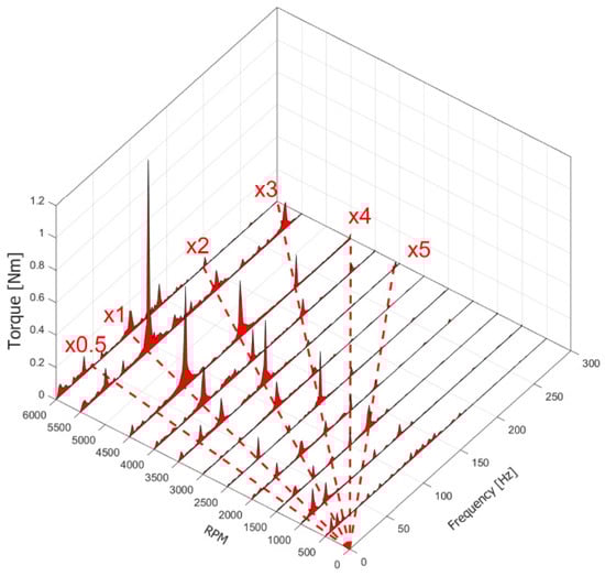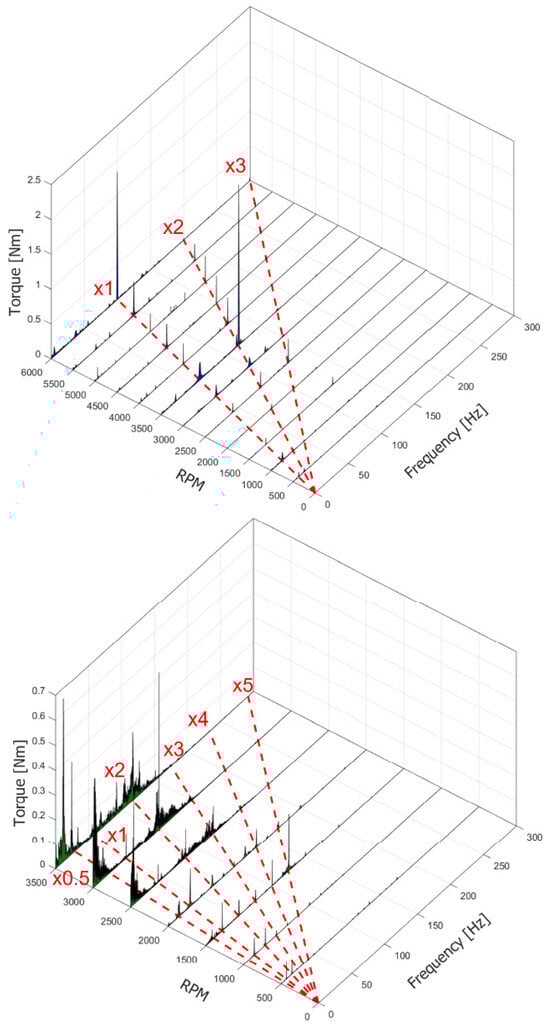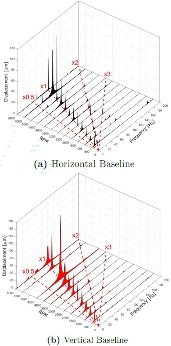 Now the signals from the proximitor, accelerometer and torquemeter will be analyzed using a frequency spectrum cascade. Considering the proximitor signals, reported in Figure 19a and Figure 19b for the Horizontal “Baseline” and Vertical “Baseline”, respectively, it can be observed that the main frequency of the components is represented by the synchronous frequency, for both configurations. In some speed runs, the rise in the x2 component is visible, but always lower than x1.