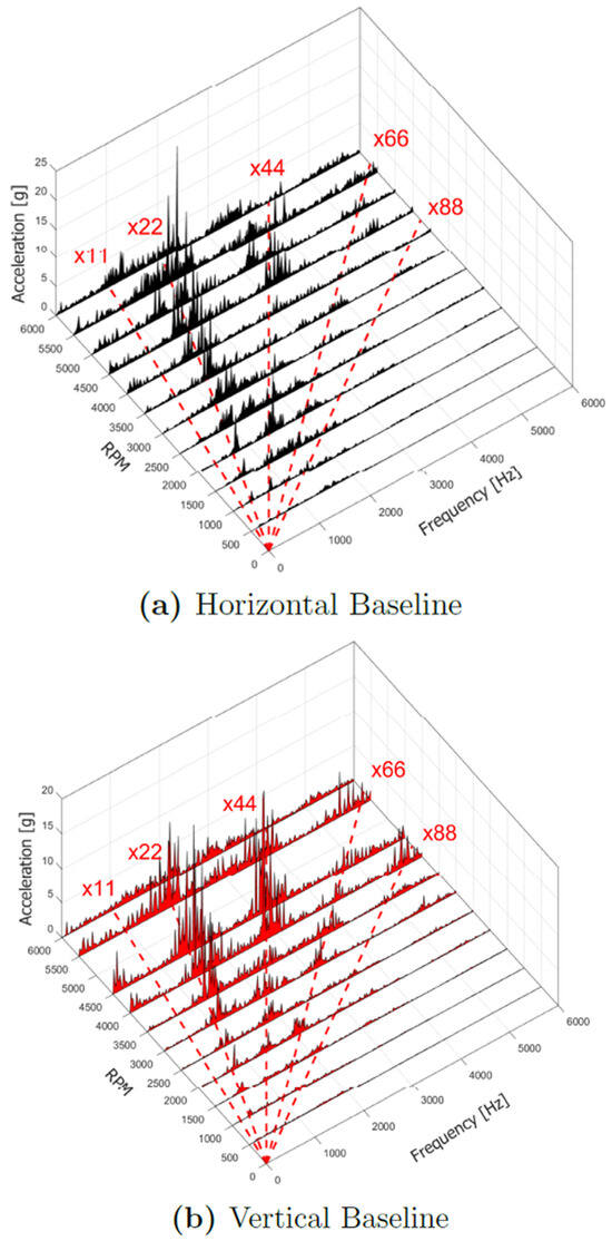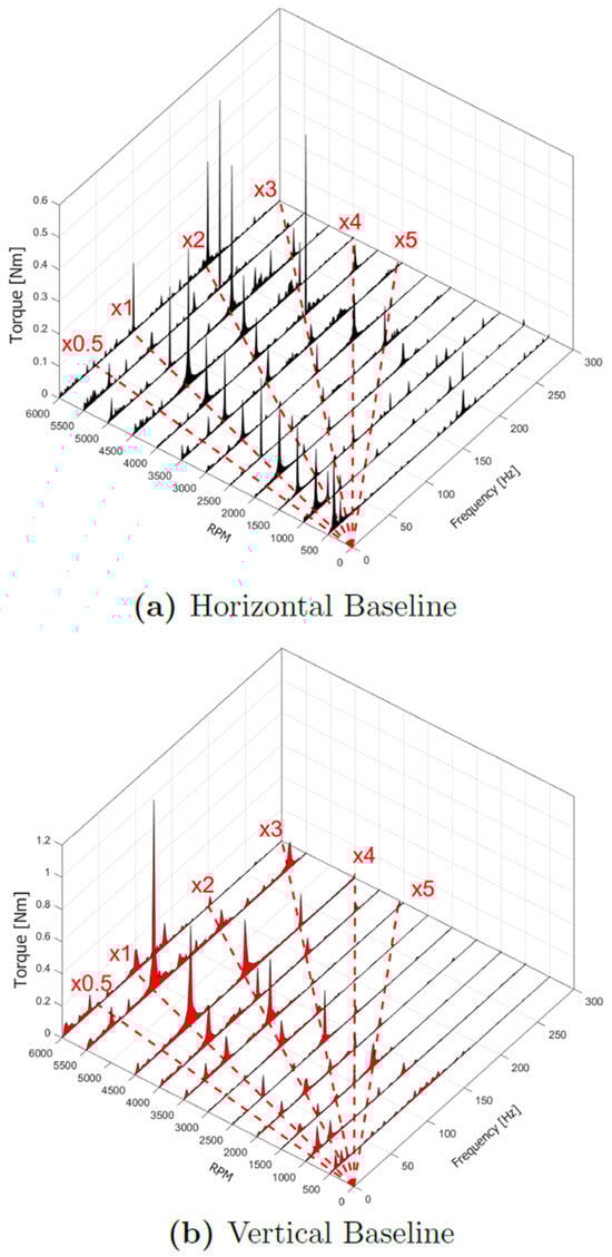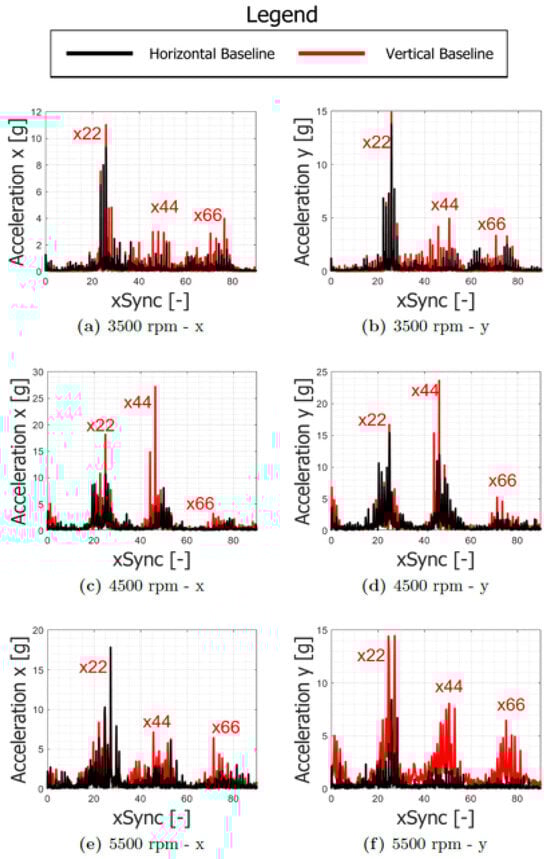 Focusing on some working speeds, frequency spectra comparison is shown in Figure 22. Conforming to the trend described in Figure 21, at 3500 and 4500 rpm vertical peaks are somewhat higher than the horizontal ones. Instead, at 5500 rpm the accelerometer in the x direction for the horizontal configuration shows a pad synchronous peak higher than that of the vertical configuration. Looking at the torque absorption in Figure 23a and Figure 23b for the Horizontal “Baseline” and Vertical “Baseline”, respectively, the behavior is a little bit different for each configuration. In particular, for the HB, the main frequency component is the synchronous one but from 3500 rpm x2 arise until they become higher than x1. In one case, at 4000 rpm, the x3 component is higher than x1 and x2. Finally, at 3000 rpm, x4 is higher than x1. Instead, for VB, x1 increases linearly with the revolution speed except for 6000 rpm. x2 is almost always present, and higher than x1 just from 3000 to 4000 rpm. x3 is present and the highest at 2500 rpm.