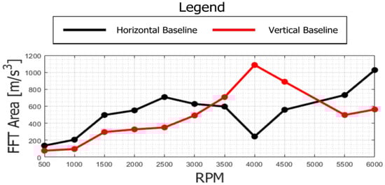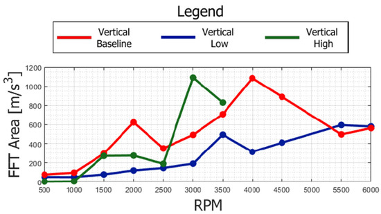 To compare the configurations at different revolution speeds, FFT areas are plotted in Figure 21. Assuming that the acceleration is a measure of the force exchanged during the contact of the PCD bearing, and therefore a measure of the dynamic stress induced by the rotor, it can be observed that the accelerations are lower for the Vertical “Baseline” configuration up to 3500 rpm, where they go over those of the horizontal configuration. Subsequently, immediately after 5000 rpm, the vertical configuration shows a better behavior.