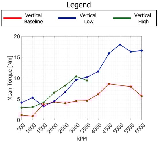 Torque mean value comparison between Vertical “Baseline”, “Low” and “High” clearance.