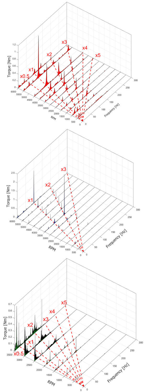 Frequency spectrum cascade comparison for torquemeter (Vertical Baseline, Vertical Low and Vertical High).