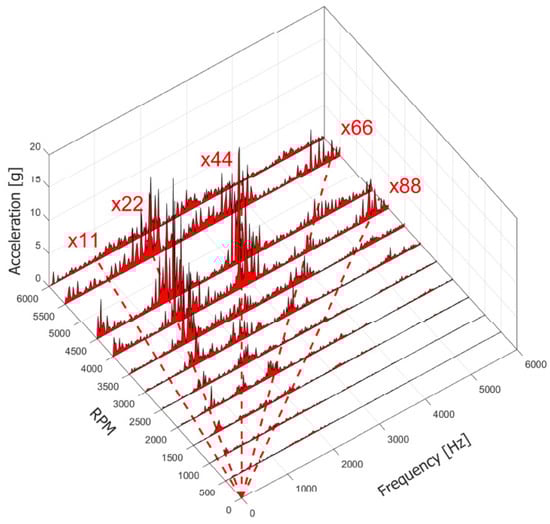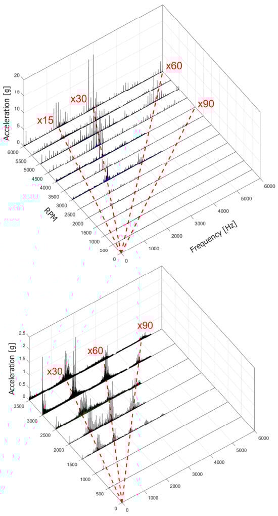 Turning to accelerations and remembering that the number of pads for the PCD bearing is 21 for the male and 22 for the female ring, we can easily see how the main frequency components are multiples of the number of pads. Waterfall diagrams are visible in Figure 20a and Figure 20b for the Horizontal “Baseline” and Vertical “Baseline”, respectively. Lower synchronous components (such as x1, x2 etc.) are not evident at speeds lower than 3000 rpm. Some of them appear from 3500 rpm, but always with an amplitude lower than the pad multiple.