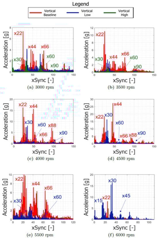 In Figure 28 are shown the waterfall diagrams for the three configurations. It is theoretically plausible that the supersynchronous components derive from the pad number. Remembering Table 3 and looking at the pad number, the Vertical “Baseline” configuration experiences x22, in strong accordance with this theory. On the other hand, the “low” and “high” configurations, despite a number of pads of 25 for the male ring and 26 for the female ring, experience multiple x30, x60 and x90. Frequency spectra comparison for the three configurations at the main running speeds (3000, 3500, 4000, 4500, 5500 and 6000 rpm) are shown in Figure 29. Interestingly, the VB configuration experiences the highest accelerations up to 6000 rpm, where there is a drastic reduction in peaks. The VH configuration has the lowest peaks. This is probably due to the increased clearance that permits the metal bellows to slow down the rotor before impact.