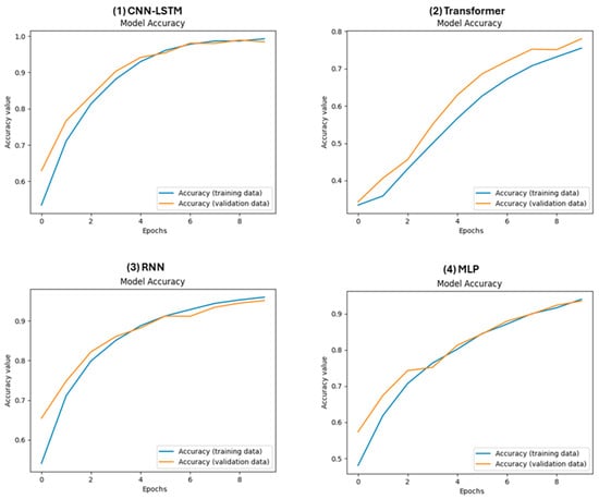 Alongside the primary deep neural network architecture that combines convolutional layers and bidirectional LSTM layers, this study also rigorously tested and compared other deep learning methods, including recurrent neural networks (RNNs), multilayer perceptrons (MLPs), and Transformer models, to classify motor imagery EEG signals. Each model was meticulously implemented and evaluated to understand its strengths and limitations in handling the complexity of EEG data. These algorithms were selected due to their suitability for handling BCI data, given their strengths in processing sequential data, capturing complex patterns, and leveraging advanced attention mechanisms. This diverse set of models ensures a thorough evaluation, providing a comprehensive assessment of different deep learning approaches for EEG signal classification and enhancing the understanding of their respective capabilities and limitations in the context of brain–computer interface systems.