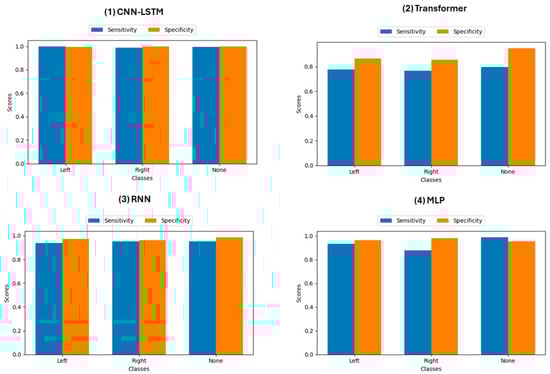 The figure presents bar charts comparing sensitivity (blue) and specificity (orange) across the following different classes: ‘left’, ‘right’, and ‘none’.