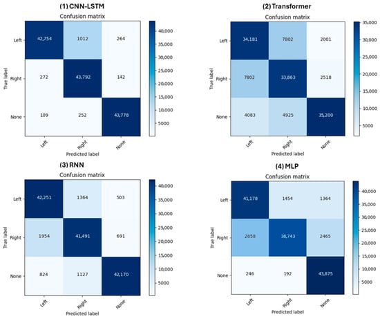 The novelty of this paper lies in its comprehensive comparative analysis and the implementation of an advanced model in real-time hardware testing. Unlike previous studies that primarily focus on either enhancing classification accuracy or feature extraction, this research uniquely integrates and evaluates a variety of neural network architectures, including RNNs, MLPs, Transformer models, and CNN-LSTM networks. This extensive comparison highlights the superior performance of the CNN-LSTM model in effectively capturing both spatial and temporal features from EEG signals. While earlier works have successfully implemented the real-time control of devices, this paper distinguishes itself by not only achieving a high classification accuracy but also rigorously validating the model’s performance in a real-time setting. By continuously testing and providing immediate feedback through detailed performance metrics, the study underscores its practical applicability and potential for real-world BCI applications. This dual focus on theoretical advancements and practical implementation significantly contributes to the field, offering a resilient framework for future human–machine interaction technologies.