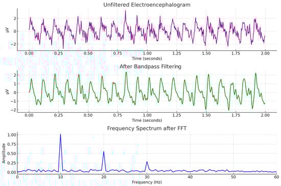 This visualization effectively demonstrates the impact of the preprocessing steps, showing how the Butterworth bandpass filter isolates the desired EEG components and eliminates noise. The frequency spectrum after FFT closely follows the filtered signal, with a significant attenuation of frequencies above 50 Hz, providing a clear representation of the EEG signal’s primary frequency components.
