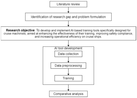 The problem to be addressed is the absence of AI-enhanced training solutions for cruise machinists, leading to suboptimal training outcomes and compromised safety and efficiency in cruise ship operations. The objective of this research is to develop and implement AI-based training tools designed for cruise machinists, aimed at enhancing the effectiveness of their training, improving safety compliance, and increasing operational efficiency on cruise ships. In order to achieve this objective, the methodology part contains the development steps of an AI-based tool. The paper ends with a comparative analysis in order to give the best suited solution for the identified problem, as shown in Figure 1.