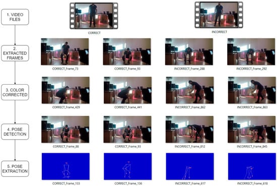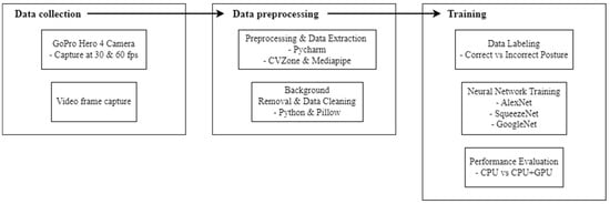 Data Preprocessing: Following data collection, video frames were extracted and subsequently preprocessed (Figure 3). During this phase, each frame was processed through a Python (version 3.10.12) script which utilized non-intrusive techniques to extract 3D view-invariant relative joint positions and angles. This method ensured that the data remained independent of camera viewpoint variations, which is critical for accurate posture analysis in a dynamic environment. The application prototype used in this project incorporated the Python libraries within a script to refine the capture of worker motion. The motion data extracted then underwent a thorough cleaning process using another Python script leveraging the Pillow library. This script removed backgrounds from captured images, replacing them with a simplified 8-bit color (dark blue in our case) to enhance the clarity of the skeleton representation of the body positions. After the cleaning and extraction phase, each frame was analyzed to remove any with invalid data or missing elements. At this stage, all data were labeled into two categories: correct posture and incorrect posture. This labeled data then formed the basis for training the neural networks.