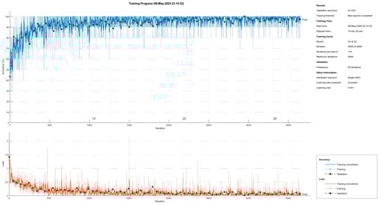 The training of GoogleNet provided further insights into the performance disparities between CPU and GPU environments. As shown in Figure 7, the GPU-trained GoogleNet model displayed a quick improvement in validation accuracy, peaking at 97.22% within just 19 min and 26 s. The loss trends followed a declining trajectory, consistent with an effective learning process (Table 1).
