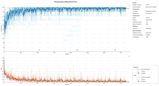 Conversely, as illustrated in Figure 8, the GoogleNet model trained on a CPU achieved a slightly higher validation accuracy of 97.57%, albeit over a considerably longer duration of 89 min and 29 s. This extended period allowed for deeper model refinement, which was particularly evident in the stabilization of accuracy and loss rates at the later stages of training (Table 1).