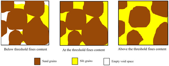 The term “threshold fines content” was introduced in the 1990s to describe the fines content at which a soil composed of sand and non-plastic silt transitions from behaving as a sand (i.e., exhibiting high strength and low compressibility) to behaving as a silt (i.e., exhibiting low strength and high compressibility) [3]. This transition point has also been referred to as “the limiting fines content” [4], “the critical fines content” [5], “the limiting silt content” [1], “the limiting fines value” [6], and “the transitional fines content” [7].
