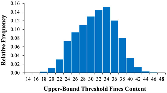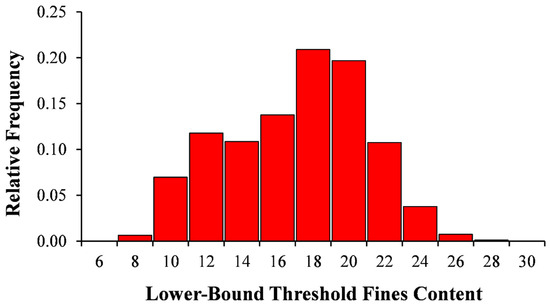 Using index data reported in the literature for 127 sands and 53 non-plastic silts [1,2,3,4,5,6,7,8,9,10,11,12,13,14,15,16], the upper- and lower-bound threshold fines contents were calculated for the 6731 combinations of sand and non-plastic silt in order to determine a range of typical values for the upper- and lower-bound threshold fines contents. The analysis found that all 6731 combinations had upper-bound threshold fines contents between 15% and 46%, with a mean of 30.5%, a median of 30.8%, and a standard deviation of 4.9%. Similarly, it was found that all of the lower-bound threshold fines contents were between 7% and 38%, with a mean of 16.1%, a median of 16.7%, and a standard deviation of 3.9%. Figure 3 and Figure 4 provide histograms of the distribution of the maximum upper-bound and minimum lower-bound threshold fines contents, respectively.