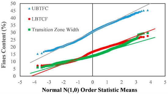 How well the distribution of the threshold fines contents matched a normal distribution was evaluated through quantile testing. The upper-bound threshold fines contents, the lower-bound threshold fines contents, and the widths of the transition zones were all found to be approximately normally distributed. Figure 6 presents the normalcy plots for the three threshold fine contents evaluated. Table 1 presents the results of the quantile testing performed on the threshold fines contents, including the R-value for the distribution and the R-value that needs to be exceeded to declare the distribution a normal distribution at the 5% level.