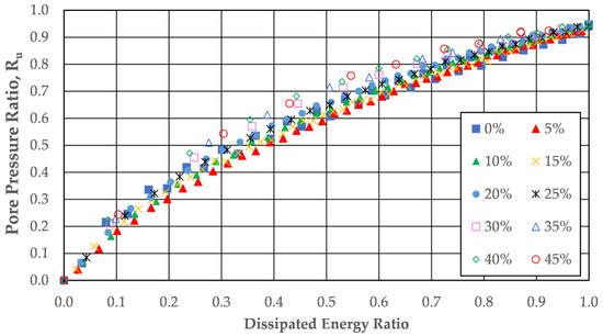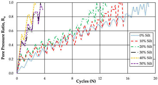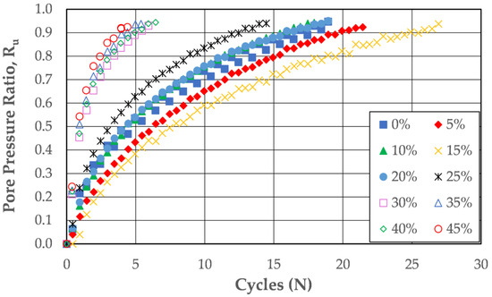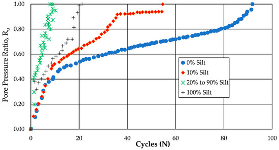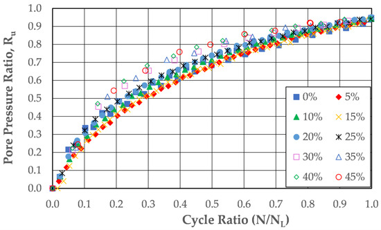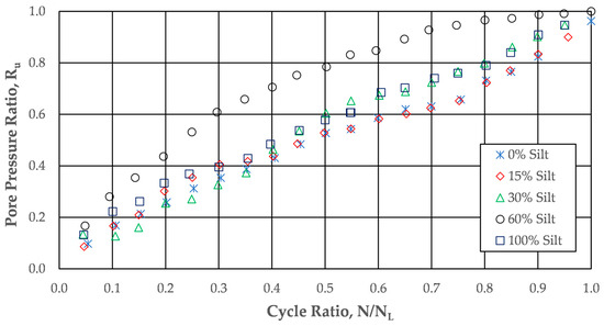 The pore pressure generation data from each of the cyclic direct simple shear tests loaded with an applied strain of 0.5% shear strain were also plotted against the cycle ratio, which is the ratio of the cycle of loading to the number of cycles of loading required to initiate liquefaction. This plot is presented in Figure 14. It presents the test results in a manner similar to the method used by Baziar et al. [23], whose results were presented in Figure 9. Similar behaviors were observed for the soils tested in the cyclic triaxial tests.