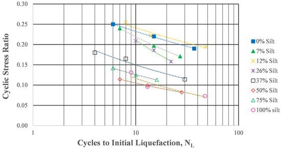 In Figure 13, one may observe that there is a gap between the soil mixtures with silt contents below the upper-bound threshold fines content of 28.9% and those with silt contents above the upper-bound threshold fines content. This division between the two groups of soil mixtures is similar to the division seen in the data from the literature presented in Figure 7 (after [21]) and Figure 8 (after [22]). Similar behaviors were observed for the soils tested in the cyclic triaxial tests.