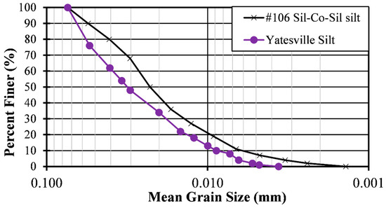 Yatesville silt is a non-plastic silt. It has a specific gravity of 2.77, a maximum grain size (D100) of 0.074 mm, a median grain size (D50) of 0.031 mm, a coefficient of uniformity (Cu) of 4.38, and a coefficient of curvature (Cc) of 0.93. It has a maximum index void ratio (emax) of 1.723 and a minimum index void ratio (emin) of 0.727. Its grain size distribution curve is presented in Figure 12.