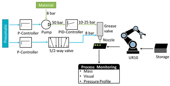 In order to generate sufficient samples for statistical analysis of the pressure curves and all influencing parameters, an automated test rig had to be set up. Figure 1 shows the basic setup with the main components. The test stand contains a buffer storage for plastic plates, which are used as specimens. An industrial robotic arm with vacuum gripping technology is used to move the specimen. An MPP03Pro pulse valve is used to ejaculate grease in pulsing mode onto the specimen. A pressure sensor is used to measure the pressure flow during the application process. A high-precision scale is used to measure the grease mass after application. A camera is used to analyze the shape of the grease.