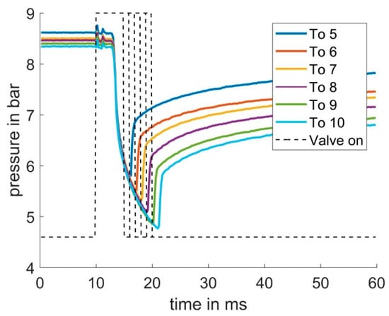 The pressure curves of grease application processes follow a characteristic shape as shown in Figure 3. In addition to the four valve control variables mentioned in Section 2.2, there are other variables that influence the pressure curve behavior. For example, even when using the same type of grease from the same manufacturer, the viscosity can vary greatly within an NLGI class. Temperature can also have a significant effect on grease viscosity. Unfortunately, grease can also change its system behavior depending on storage time and storage weight. The so called “oil bleeding” effect can cause a separation of grease and oil based on high and continuous pressure, which in turn can cause areas of varying viscosity in stored grease (see [,] for a deeper explanation). Therefore, these factors can also influence the curve but were not considered in this paper.