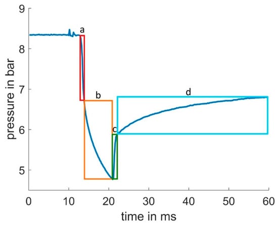 Based on the shape of the pressure curve, nine key features were extracted: the lowest pressure reached, the slope of the fast pressure drop, the approximated T1 time constant for the slow pressure slope, the slope of the fast pressure inclination, and finally the approximated T1 time constant for the slow pressure regeneration phase. The selected areas are shown in Figure 4. The pressure curve was used to extract 16 features in total. These areas of interest correspond to the locations a, b, c, and d from Figure 4. If the feature was during the “on” time of the pulsing valve (when the valve was opened and ejected grease) the name of the feature includes “On”, which corresponds to all features extracted from areas a and b of Figure 4. Features extracted during the “off” time of the valve (when the valve is closed, no grease is ejected, and pressure builds up) include “Off” in their name. Features that are extracted during the phase of rapid decline and increase in pressure (Figure 4a,c) include “K” in their name. Features that are extracted during the slow decline or increase phase (Figure 4b,c) include “T1” in their name. This understanding is mandatory to understand the origin of the features in Table 1.