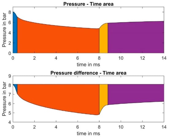 Pressure curve area features extracted according the defined areas of interest. The picture above shows the pressure–time area, while the picture below shows the pressure difference–time curve. Both cases are shown for a pulsing and regeneration process.