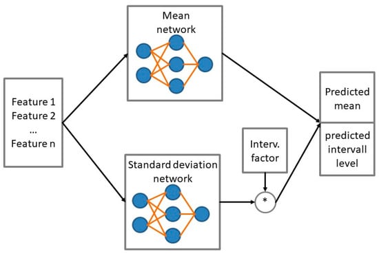The mean network output is used to track the general trend of the feature, and the standard deviation network output can be used to predict the upper and lower limits of the feature. If a specific interval for the feature is desired, the output of the network can simply be multiplied by a. The result of this architecture will be both the predicted mean and the predicted standard deviation. As input to the neural networks, the valve process parameters already described in Section 2.2, including the pressure curve, are used.