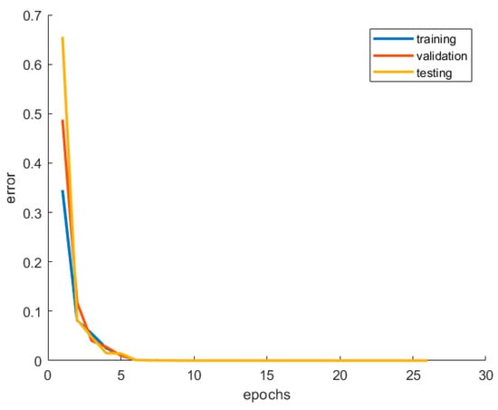 Finding the right number of neurons for the neural network training process was achieved by testing different network configurations. Figure 7 shows an example of the training progress for an exemplary feature called “areaT1OffFull”. The training finishes after 26 epochs without any increase in the error of the test set. Therefore, it can be concluded that the network has managed to generalize the dataset in a satisfactory way.