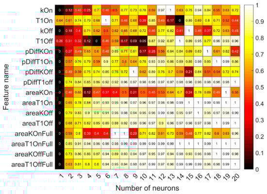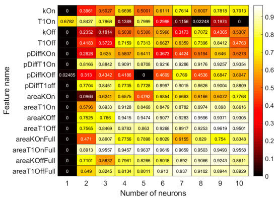 Figure 8 shows the results of the training process for each feature used by the mean network. Each column shows the best network out of 100 trained networks per feature. The features were evaluated with 1 to 10 neurons. In total, 16,000 networks were trained and compared. The result of the test set was normalized between 0 and 1, where 0 means high error and 1 means low error. Smooth features, such as most area features, usually show a rapid increase in performance as the number of neurons increases. Noisy features, such as pressure curve time constants and slopes, have a noisier performance as the number of neurons trained increases. For all features, a single neuron could not approximate the data accurately enough. Feature T1On was the only one that had the best approximation with only two neurons.
