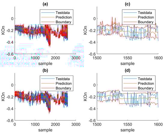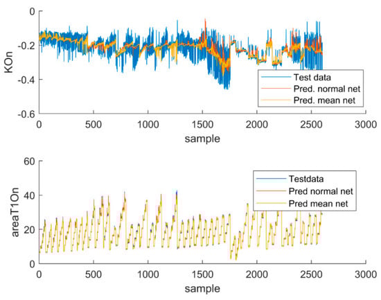 After both mean and full networks are trained, they will be combined with the standard deviation network to calculate the upper and lower boundaries of the regression value. Figure 11 shows a 1-sigma interval for F1 for both networks. The result using the full network appears to have a higher variance than the mean network. This can be seen in Figure 11c,d where 1500–1600 samples are shown. The reason for the lower variance of the mean network is the smoothing effect of the mean network, as both networks use the same standard deviation network. The mean absolute error (MAE) also supports this assumption. The mean network has an MAE of 0.0398 for the feature KOn, while the full network has a lower MAE of 0.0381 over all samples.