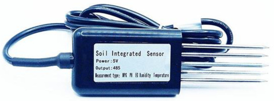 The JXCT 7-in-1 soil sensor (Weihai JXCT Electronic Technology, Shandong, China), which identifies the soil’s potassium, phosphorus, nitrogen content, temperature, pH, moisture content, and electrical conductivity, is shown in Figure 1. It works with Modbus RS485 and benefits from a low cost, a quick response, high precision, and portability. It facilitates the systematic evaluation of the soil conditions by assisting in assessing the soil’s fertility. The sensor can be buried in the ground for a very long time. To ensure the long-term functionality of the probe component, it features a high-quality probe that is resistant to corrosion from salt and alkali, rust, and electrolysis. It is therefore appropriate for all types of soil, including alkaline, acidic, substrate, seedling beds, and coconut bran soil. This sensor’s advantages over more conventional detection techniques are its extremely quick measurements and highly precise data. It only needs its probe to be buried in the ground, and Arduino can be used to read the readings.