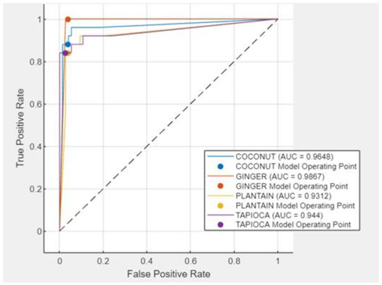 The 10-fold cross-validation method yielded favorable results, demonstrating the robustness of our models. Table 1 showcases the performance comparison for different crops using a k-fold cross-validation on the measured dataset. Among the various algorithms, KNN emerged as the best method, achieving a maximum accuracy of 84%, a precision of 85%, a recall of 88.8%, and a specificity of 92.4%. These metrics highlight KNN’s effectiveness in accurately classifying soil characteristics. Furthermore, Figure 5 illustrates the confusion matrix for the KNN 10-fold model, providing a detailed view of its classification performance, while Figure 6 displays the ROC curve, underscoring the model’s ability to distinguish between classes with high precision. This comprehensive analysis affirms KNN’s superior performance in our study.