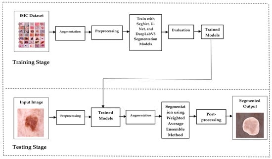 The system leverages an ensemble of U-Net [], SegNet [], and DeepLabV3 [] to improve segmentation accuracy and robustness. U-Net excels at capturing fine details for precise lesion boundaries, SegNet maintains spatial resolution during upsampling, and DeepLabv3 handles multi-scale lesions with atrous convolutions. This ensemble outperforms individual models on the challenging ISIC dataset, making it applicable in real-world clinical scenarios. The segmentation model’s ability to accurately identify lesion borders aids early detection and the diagnosis of skin malignancies, improving outcomes for patients. Figure 1 describes the segmentation design. The ISIC dataset [], used for model training, includes 2357 images of various benign and malignant skin conditions, with a focus on three key cancers: melanoma (438 images), basal cell carcinoma (376 images), and squamous cell carcinoma (181 images). The ISIC 2018 dataset is a large and comprehensive dataset used for the analysis of skin lesions, particularly for tasks such as segmentation, classification, and the detection of skin cancer. It was made available as part of the International Skin Imaging Collaboration (ISIC) challenge, aimed at improving the early detection of skin cancer. The dataset contains 10,015 high-resolution dermoscopic images, each labeled with diagnostic information confirmed by expert dermatologists. The images cover various types of skin lesions, with a focus on conditions such as melanoma, BCC, and SCC, among others. The dataset is diverse, including images from different skin types, lesion shapes, sizes, and locations, providing a robust foundation for developing machine learning models that can generalize well to real-world scenarios. Each image is provided in JPG format with varying resolutions, making it essential to preprocess the images before feeding them into models.