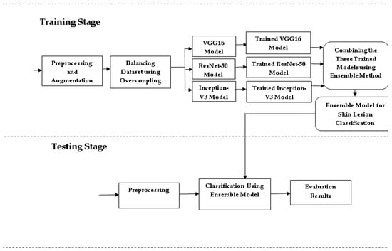 The proposed system combines VGG16 [], ResNet-50 [], and Inception-V3 [] architectures to enhance skin lesion detection and classification by addressing key challenges in dermatological image analysis, such as class imbalance, low intra-class variability, and high inter-class similarity. The ISIC dataset, a comprehensive collection of dermoscopic images, is used for this study. To mitigate class imbalance, oversampling strategies are applied, particularly to underrepresented classes []. Figure 2 shows the architecture design for skin lesion classification. The dataset is split into 75% for training and 25% for testing, with images resized to 224 × 224 pixels for VGG16 and ResNet-50, and 299 × 299 pixels for Inception-V3. Image preprocessing includes normalization using the min-max technique [], scaling pixel values between 0 and 1 to ensure consistent feature contribution. Additional preprocessing steps, such as data augmentation (e.g., rotation, flipping, and zooming), further enhance model performance by increasing data diversity []. These include Center Crop to focus on central features, Random Rotate, Grid Distortion, Flips (Horizontal/Vertical), Optical Distortion, and Affine transformations, all applied with a 0.1 probability to introduce controlled distortions and variations. These augmentations helped the model learn robust features by increasing the diversity of the dataset.