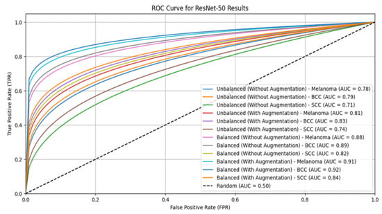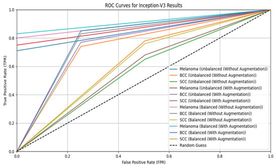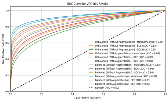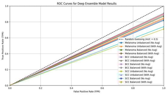 The ensemble model with augmentation significantly outperforms individual models like VGG16, ResNet-50, and Inception-V3 in skin lesion classification for both the original and balanced ISIC datasets. On unbalanced datasets without augmentation, the ensemble model achieves the highest accuracy at 0.78 and, with augmentation, it reaches 0.90. On balanced datasets, the ensemble model’s accuracy improves to 0.92 without augmentation and 0.99 with augmentation, consistently outperforming the individual models. These results highlight the effectiveness of combining multiple models with balanced datasets and augmentation, making skin lesion classification more accurate and reliable. This approach enhances diagnostic precision and holds potential for broader use in medical image analysis. Table 8 describes the confusion matrix. The ROC curves for VGG16, ResNet-50, Inception-V3, and the ensemble model for skin lesion classification using both balanced and unbalanced datasets, with and without augmentation, are shown in Figure 3, Figure 4, Figure 5 and Figure 6.