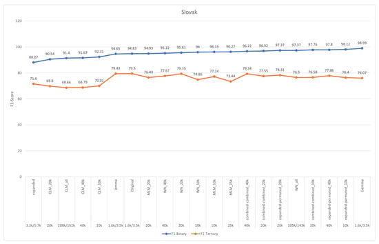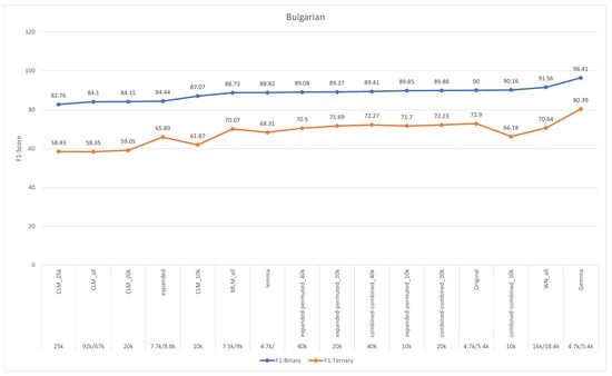 Table 4 displays the final distribution of the original, expanded–combined, and expanded–permuted datasets. For the expanded–combined and expanded–permuted datasets, we varied the training set by sampling 10k, 20k, and 40k instances for each class. In the cases of WN, MLM, and CLM, the augmentation methods affected the final size of the training set, as the process of augmentation is influenced by several factors, including the nature of the original text, the matching of the words, WordNet, and semantic constraints. We obtained 10,000 and 20,000 (and, in some cases, 25,000 and 40,000) samples to be trained and tested for all languages, except for Bulgarian, where the number of instances remained low.